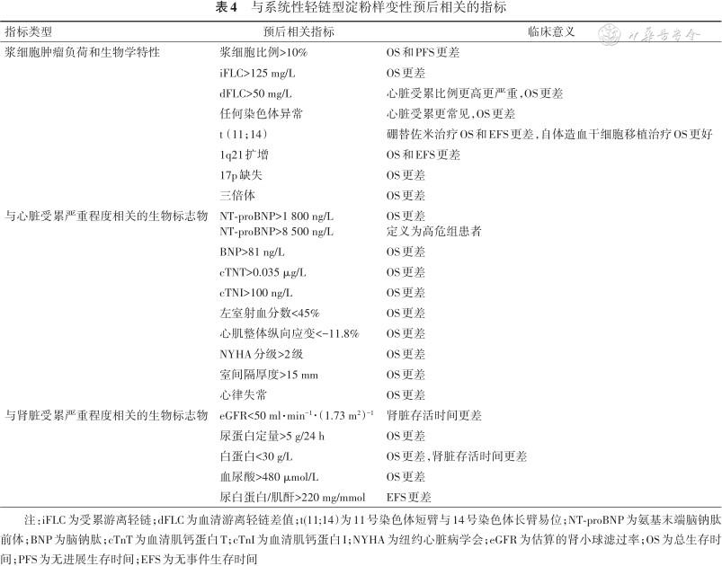 建议从累及脏器的严重程度以及浆细胞肿瘤负荷和生物学特性两方面对AL型淀粉样变性患者进行危险分层和预后判断。表4列出了目前发现与AL型淀粉样变性患者预后相关的因素[10],建议根据列表中的指标对患者进行预后评估。