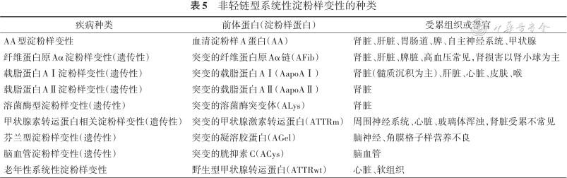 建议AL型淀粉样变性与下列两类疾病作鉴别诊断:一类是其他类型的淀粉样变性(表5),另一类是M蛋白相关的其他疾病。其他类型淀粉样变性包括血清淀粉样A蛋白(AA)型淀粉样变性、遗传性淀粉样变性和局限性AL型淀粉样变性。