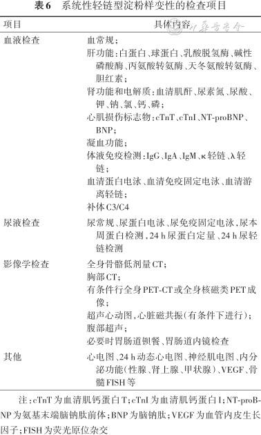 AL型淀粉样变性在诊断后还需要评估器官/组织受累及情况,一般来说一旦经过一个部位的病理活检证实为淀粉样变性后,其他器官/组织是否受累不需要再行病理活检,而是通过影像学、实验室检查以及相关的临床表现来证实(表6)。