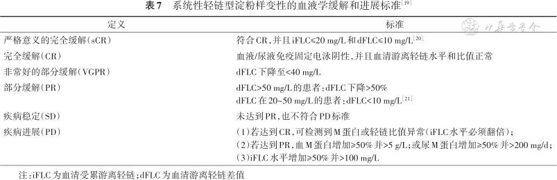 系统性轻链型淀粉样变性的血液学缓解和进展标准[19]