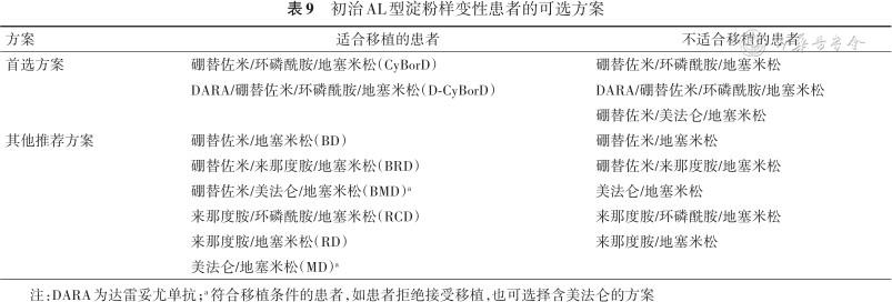 目前AL型淀粉样变性的主要治疗方案都是针对克隆性浆细胞的治疗,初治患者推荐的治疗方案见表9。两个疗程后血液学疗效评估为PR及以下疗效的患者需及时更换为二线方案以争取更好的血液学缓解和最大程度的重要器官缓解。