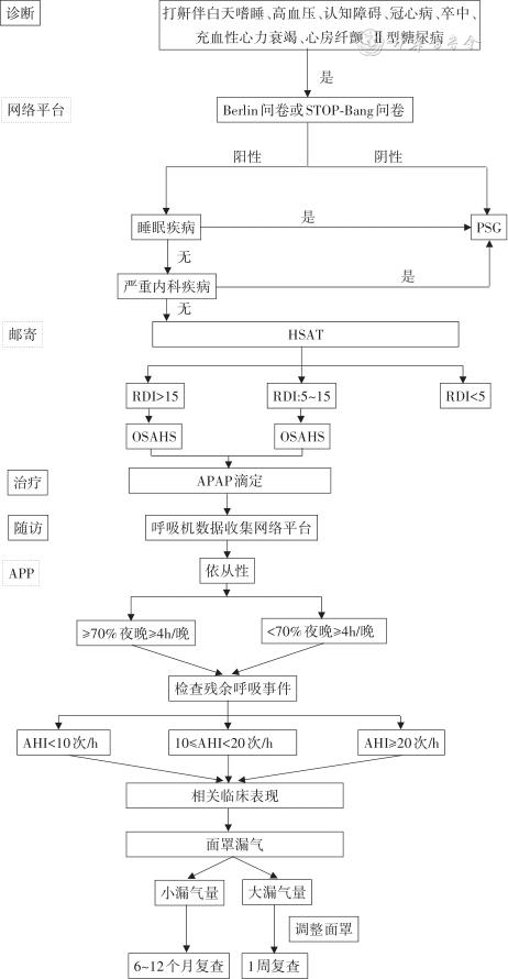 注:OSAHS为阻塞性睡眠呼吸暂停低通气综合征;PSG为多导睡眠监测;HSAT为家庭睡眠呼吸暂停监测;RDI为呼吸紊乱指数;APAP为自动持续气道正压;AHI为睡眠呼吸暂停低通气指数