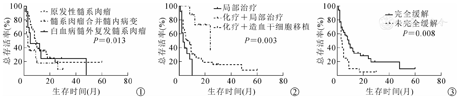 原发性髓系肉瘤、髓系肉瘤合并髓内疾病、白血病缓解后以髓系肉瘤形式复发患者的1年OS分别为16.0%,37.5%,36.9%,差异统计学意义(P=0.013,表2、图1)。局部治疗组,化疗联合局部治疗组,化疗联合allo-HSCT组的1年OS分别为:0、28.1%和72.9%,差异有统计学意义(P=0.003,表2、图2)。治疗后完全缓解、未完全缓解者1年OS分别为:34.9%、10.0%,差异统计学意义(P=0.008,表2、图3)。3例移植后受者应用地西他滨维持治疗(6 mg·m-2·d-1×3 d,静脉滴注,约每4周为1疗程),目前均长期存活(中位随访时间14个月),持续随访中。