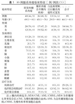 自2010年1月1日至2019年5月1日于郑州大学第一附属医院确诊的89例髓系肉瘤患者作为研究对象,回顾性分析年龄、性别、侵犯部位、类型、染色体核型分析[预后危险度分级参照《成人急性髓系白血病中国诊疗指南(2017年版)》]、突变基因、免疫表型、治疗手段、随访时间及结局等。将89例髓系肉瘤患者按疾病分型不同分为三组(分型标准参阅文献[1]):原发性髓系肉瘤组(40例,44.9%)[其中21例行局部治疗(手术切除、鞘内注射、局部放疗)、19例行化疗联合局部治疗];髓系肉瘤合并髓内疾病组(36例,40.5%)(其中4例行局部治疗、25例行化疗联合局部治疗、7例行allo-HSCT);白血病髓外复发标志的髓系肉瘤(13例,14.6%)组(其中12例行化疗联合局部治疗、1例行allo-HSCT)。髓系肉瘤的诊断参照2008年世界卫生组织(WHO)淋巴与髓系肿瘤诊断标准。(表1)