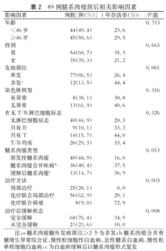 89例患者中发病部位切取后行活组织病理检查及免疫组化测定,髓过氧化物酶(MPO)阳性率为87.5%(77/88);CD43阳性率为88.7%(47/53);CD117阳性率为65.9%(29/43);CD34阳性率为51.5%(17/33);淋巴细胞标志CD7阳性率41.4%(12/29);CD5阳性率40%(4/10);TdT阳性率为30.5%(18/59);CD3阳性率32.6%(28/86);CD79a阳性率为29.5%(13/44);CD20阳性率为15.1%(13/86);CD10阳性率为11.8%(4/34)。55.1%(49/89)髓系肉瘤患者表达淋巴细胞表面标志,有无淋巴细胞表达(P=0.064)及有无T/B淋巴细胞标志表达(P=0.326)预后差异无统计学意义(表2)。