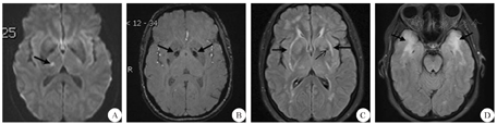 A:DWI上可见右侧丘脑新发梗死(箭头所示);B:SWI上可见双侧基底节区局灶性铁沉积(箭头所示);C:FLAIR上可见脑白质多发异常对称性高信号,累及外囊(粗箭头所示);左侧基底节区可见扩张血管间隙(细箭头所示);D:FLAIR上可见脑白质多发异常,累及双侧前颞叶(箭头所示);DWI:扩散加权成像;SWI:磁敏感加权成像;FLAIR:液体衰减反转恢复序列