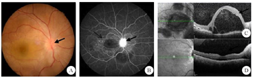 A:眼底照相,箭头示视盘轻度水肿;B:FFA,粗箭头示视盘荧光素着染,细箭头示视网膜环状荧光斑;C:OCT,箭头示视网膜神经上皮层脱离;D:复查时OCT;FFA:眼底血管造影;OCT:光学相干断层扫描