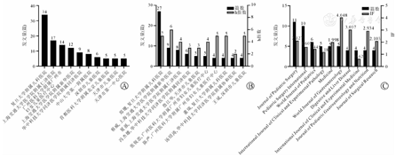 中国共发表英文文献158篇,2018年发表数量最多(n=45,28.48%,图1A),复旦大学附属儿科医院(n=34,21.52%),上海交通大学医学院附属仁济医院(n=17,10.76%)、广州医科大学附属广州市妇女儿童医疗中心(n=14,8.86%)、上海交通大学医学院附属新华医院(n=12,7.59%)发文10篇以上(图3A)。图3B描述发表英文文献量前十的中国学者,郑珊发文最多;蔡威h指数较高,说明其文章引用度更高,更具影响力。这些作者应当是国内胆道闭锁领域的核心作者。