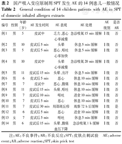 14例发生AE者年龄均在12岁以内,男13例,女1例;2例年龄在6岁以内,12例介于6~11岁;3例发生在SPT过程中,11例SPT结束后0.5 h内出现;表现为皮肤症状1例,神经症状(头晕)5例,消化道症状(腹痛、恶心、呕吐)10例,心血管症状(心率减慢2例、加快1例)3例,乏力1例,出汗1例,血压轻度下降1例;严重程度分级均为Ⅰ级。其中1例7岁患儿操作结束后30 min出现局部皮肤斑丘疹,72 h后自行缓解,考虑为变应原制剂相关的药物AR(表2)。