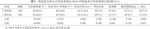 两组患儿转运时间比较差异无统计学意义(P>0.05),干预后组在对口医院转诊出发前、以及到达NICU时体温均高于干预前组,差异有统计学意义(P<0.05),见表2。