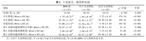 | 指标 | BPD组(n=25) | 早产儿对照组(n=30) | 足月儿对照组(n=30) | F值 | P值 |