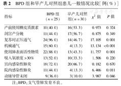 | 指标 | BPD组(n=25) | 早产儿对照组(n=30) | χ2值 | P值 |