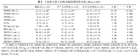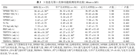 注:BPD:支气管肺发育不良,TPTEF/TE:达峰时间比,VPTEF/VE:达峰容积比,TPTEF:达峰时间,VPTEF:达峰容积,Ti/Te:吸气时间与呼气时间比值,TV/kg:公斤体重潮气量,PEF:呼气峰流量,TEF75%:75%潮气量时呼气流量,TEF50%:50%潮气量时呼气流量,TEF25%:25%潮气量时呼气流量,TEF50%/TIF50%:呼气中期流量与吸气中期流量比值;与早产儿对照组比较,aP<0.05;与足月儿对照组比较,bP<0.05。