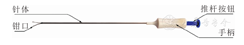 腹壁吻合器:型号WHQ-1.6A(专利号ZL201520944454.0),针体直径为1.6 mm,手柄内含弹簧,未按压推杆按钮时抓钳钳口位于针体内部,按压推杆按钮时抓钳钳口释放(图1)。