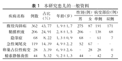 | 腹股沟斜疝 | 362 | 43.77 | 1.9±1.7 | 275 | 87 | 191 | 171 |