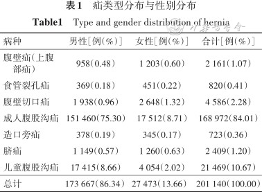 自2017年10月14日至2021年6月7日,共有600家医院或分中心加入中国疝病专科联盟登记随访系统,累积病例201 141例,包括腹壁疝(上腹部疝)、食管裂孔疝、腹壁切口疝、腹股沟疝、造口旁疝、脐疝、儿童腹股沟疝,见表1。成人腹股沟疝占比最大,为84.01%,男女发病比例约为9∶1,与教科书记载的男女发病比例约10∶1相近。腹壁疝、脐疝和造口疝占比约为5.00%,食管裂孔疝较少为0.41%。