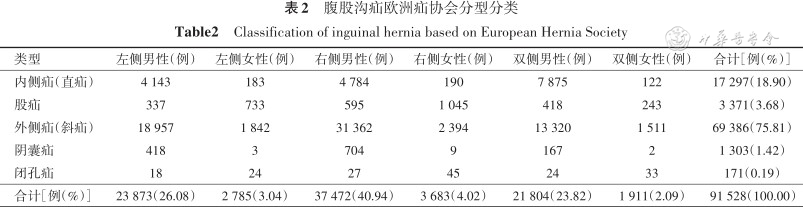 基于中国疝病注册登记随访系统,严格筛选2017年10月14日至2021年6月7日信息完整且随访率>70%的腹股沟疝数据。根据欧洲疝协会(EHS)分型分析,91 528例腹股沟疝中,内侧疝(直疝)占比为18.9%,外侧疝(斜疝)占比为75.81%,临床上斜疝发病率远高于直疝。股疝发病率低,约为3.68%,但女性股疝发生率高于男性。闭孔疝最少见,男女发病大体平衡。见表2。