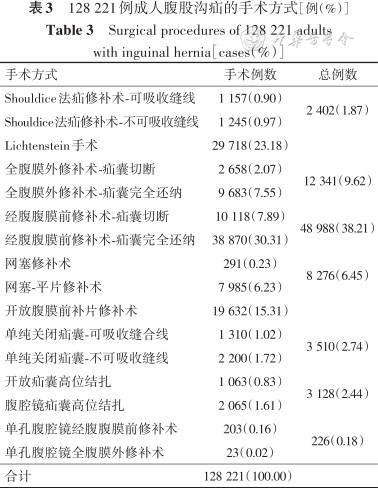 128 221例成人腹股沟疝的手术方式[例(%)]