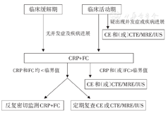 对于确诊小肠CD患者,需监测疾病活动度。首先考虑非侵入性评估方式,定期行CRP、FC评估。若FC和(或)CRP水平持续高于临界值且动态升高,应使用适当的影像学技术或内镜检查重新评估疾病活动性,优化治疗策略。对于儿童和年轻患者,多优先选择MRE或IUS。由于辐射暴露,CTE不是首选方法。见图2。