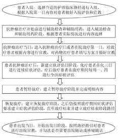 流程中同样考虑到了护理路径的变异。临床路径作为一种指导或建议,适合大多数患者,但并非所有患者。在使用路径时,一定会发生患者实际情况偏离路径,做出自主决策的状况。变异有利于工作质量的改进,能为护理临床路径提供信息反馈。以综合治疗病房为例,其对路径变异的编码如下:①患者因疾病原因终止化疗、放疗并且集中治疗疾病引起的并发症;②患者病重、病危;③患者进行外科手术治疗;④转入ICU; ⑤死亡。