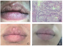 照射后嘱咐患者尽量保持患处干燥,局部可涂抹红霉素眼膏预防感染。照射后20 d,病变部位颜色开始变深,逐渐结痂,27 d结痂开始逐渐脱落,至35 d后结痂全部脱落,局部皮肤黏膜消肿,原淡黄色丘疹大部分消退,唇部颜色恢复正常,无紧绷等不适感觉(图1C)。本例患者随访时间8个月,未遗留瘢痕,亦未见复发迹象(图1D)。
