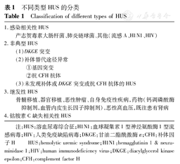 既往临床将HUS分为典型性HUS[腹泻相关性,主要指由以大肠杆菌O157∶H7为主的产志贺毒素(STX)细菌引起]和非典型性HUS(aHUS)(非腹泻相关性)[3]。随着对HUS发病机制研究的不断深入,分类也得以细化,2016儿童aHUS治疗国际共识建议将HUS分为四大类:感染诱发HUS、继发性HUS、钴胺素C缺失相关HUS以及由于先天性补体替代通路功能失调或甘油二酯酰激酶ε(DGKE)基因突变而导致的HUS[4](表1)。目前,对于aHUS的定义存在争议:大部分血液学家和肾科医师建议将aHUS一词保留给没有共存疾病或特定感染相关的HUS;而对于是否将aHUS一词限定于先天性补体和补体调节基因异常或抗补体因子H(CFH)自身抗体阳性或无基因异常相关HUS则存在争论,因为对HUS患者确认是否存在与补体相关的基因缺陷耗时耗力,可普及性不高。改善全球肾脏病预后组织(KDIGO)专家共识建议临床医师优先使用"原发性aHUS"指代强烈怀疑补体替代途径的潜在异常,并排除了继发性原因的HUS[5]。本文中的aHUS定义沿用以上最新指南共识指代存在补体成分和补体调节基因的先天性遗传异常以及DGKE突变等导致的HUS。