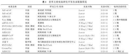 2020年6月中国康希诺生物公司与军事医学科学院陈薇院士团队合作研究开发的Ad5-nCoV疫苗1期试验结果发表[1]。这是全球最早发表的新冠病毒疫苗临床研究结果。随后,中国、英国和美国等国家的多种疫苗临床研究结果陆续在国际顶级的学术期刊发表[2,3,4,5]。