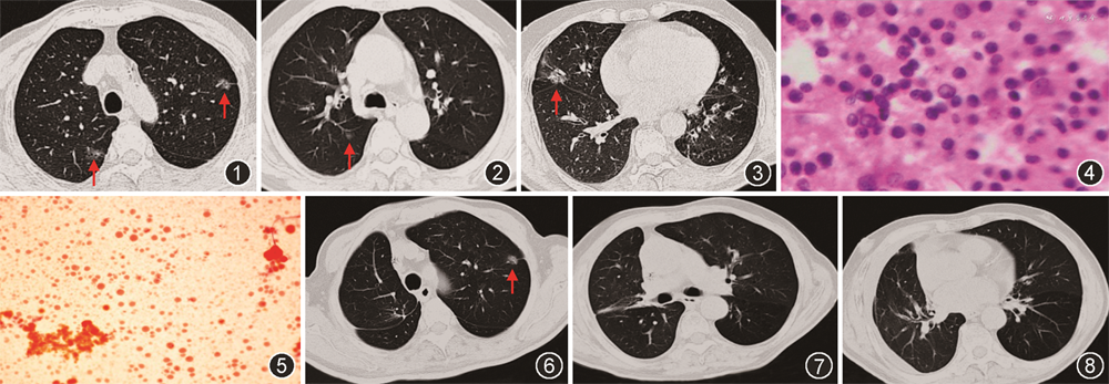 患者男,66岁,因“右肺癌术后5个月,胸闷气促4个月”于2019年11月15日入院。患者2019年5月6日肺部CT检查示右肺中叶结节,大小为1.7 cm×1.6 cm,呈混杂磨玻璃密度,其内可见血管穿行及支气管充气征,双肺多发磨玻璃结节(图1~3)。2019年6月8日行胸腔镜下“右肺上叶后段切除+右肺中叶切除+淋巴结清扫术”。术后病理示:右肺上叶后段和中叶共3处浸润性腺癌(腺泡型和贴壁型);右肺上叶后段1处原位腺癌,肿瘤均未浸润脏层胸膜,未见脉管内癌栓,支气管切缘及清扫淋巴结未查见癌。行EGFR检测21位点L858R突变。术后4 d拔除引流管出院。术后1个月患者逐渐出现胸闷气促,7月24日肺部CT示右侧大量胸腔积液,给与穿刺引流淡黄色澄清胸水后症状改善。9月14日再次出现大量胸腔积液,给予胸腔穿刺置管引流淡黄色清亮积液,先后3次胸腔积液病理未查到癌细胞,胸腔积液持续生成,10月1日给予培美曲塞1.0 g化疗1次,先后4次右侧胸腔注入顺铂(60 mg/次)治疗,口服吉非替尼250 mg,1次/d,经过上述治疗胸腔积液仍未控制,持续引流淡黄色胸腔积液。11月5日行正电子发射体层成像(PET-CT)检查,未见肿瘤转移征象,左肺上叶尖后段磨玻璃密度结节较前无变化。既往于2019年4月16日行胃间质瘤手术,病理示胃肠道间质瘤(GIST,梭形细胞型),肿瘤单发,术后口服伊马替尼400 mg,1次/d。