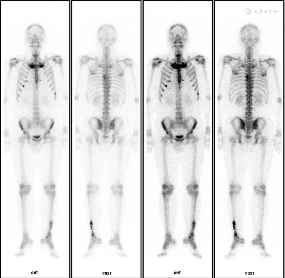 患者男,40岁,因“反复咽痛30年,双手足皮疹伴关节疼痛4年”就诊于北京大学第三医院耳鼻咽喉头颈外科。患者30年来反复发作咽痛,每年5~6次,每次发作诊断“急性扁桃体炎”,服用头孢类抗生素后可缓解,4年前出现间断双手掌、双足底脓疱疹,诊断“掌跖脓疱病?”,予米诺环素胶囊口服,环吡酮胺、卤米松乳膏外用,症状仍反复。2年前出现胸锁关节、双肩、髋关节疼痛,诊断“滑膜炎-痤疮-脓疱病-骨质增生-骨炎(synovitis-acne-pustulosis-hyperostosis- osteitis,SAPHO)综合征”,予塞来昔布胶囊治疗,效果欠佳。建议联合应用肿瘤坏死因子α(TNF-α)靶向药物治疗,患者拒绝。患者自觉咽痛发作与皮疹、关节疼痛发作无明显相关。既往长期吸烟史、左侧胫骨骨折术后。母亲患类风湿性关节炎。查体见双手掌少量红斑、脱屑,胸锁关节肿大、无触痛,左侧扁桃体Ⅱ度、右侧扁桃体Ⅰ度,未见充血,隐窝洁。实验室检查:红细胞沉降率(erythrocyte sedimentation rate,ESR)、C反应蛋白(C-reactive protein,CRP)升高,抗SS-A52抗体弱阳性,总T细胞绝对数升高,白介素(IL)-17、干扰素(IFN)-γ降低,IL-6、TNF-α升高,抗链球菌溶血素“O”(antistreptolysin O,ASO)、类风湿因子(rheumatoid factor,RF)、抗核抗体(antinuclear antibody,ANA)、人白细胞抗原(Human Leukocyte Antigen,HLA)-B27阴性。全身骨显像示“双侧胸锁关节、双肩关节、双侧多发肋骨软骨连接处、左侧第7胸肋关节符合SAPHO表现”(图1)。入院诊断为“慢性扁桃体炎;SAPHO综合征”,住院后在全身麻醉下行扁桃体切除手术,术后予二代头孢类抗感染治疗1周。患者术后1个月随访,诉掌跖脓疱消退,胸锁关节、双肩、双髋关节疼痛较前明显减轻,查体未见双手掌、足底皮疹。
