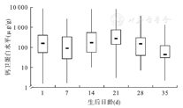 487份非NEC粪便标本中钙卫蛋白水平为143.5(47.8,391.2)μg/g,生后第1、7、14、21、28、35天的钙卫蛋白水平分别为165.1(57.4,408.2)、92.3(27.3,329.1)、175.0(59.2,556.8)、276.6(138.5,762.3)、151.2(42.8,296.4)、48.3(31.9,125.6)μg/g,差异有统计学意义(F=10.388,P<0.001)。粪便钙卫蛋白水平随日龄波动,21 d日龄时粪便钙卫蛋白水平最高,极低出生体重儿粪便钙卫蛋白水平变化趋势见图1。