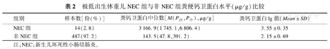 极低出生体重儿NEC组与非NEC组粪便钙卫蛋白水平(μg/g)比较
