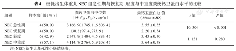 NEC组患儿急性期粪便钙卫蛋白水平高于恢复期,差异有统计学意义(t=10.304,P<0.001);NEC组轻度与中重度粪便钙卫蛋白水平差异无统计学意义(t=1.131,P=0.280),见表4。