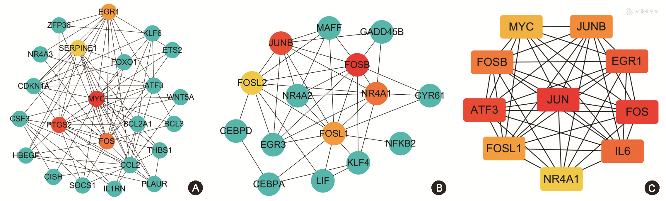 3.DEGs的PPI构建和核心基因筛选:两个关键聚类功能模块共得到10个关键基因;采用Cytohubba插件筛选出365个共同DEGs蛋白互作网络的10个关键基因,并与上述10个关键基因取交集,得到7个核心基因,分别为FOS、EGR1、FOSB、JUNB、FOSL1、MYC和NR4A1(图2)。