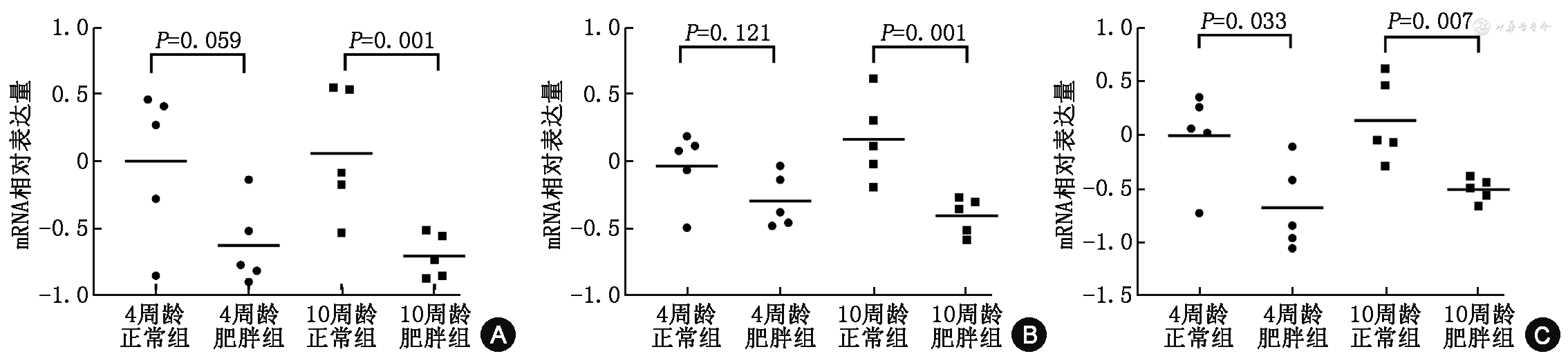 注:mRNA相对表达量=log10(某小鼠特定基因的相对表达量/全部小鼠特定基因参照池表达水平)