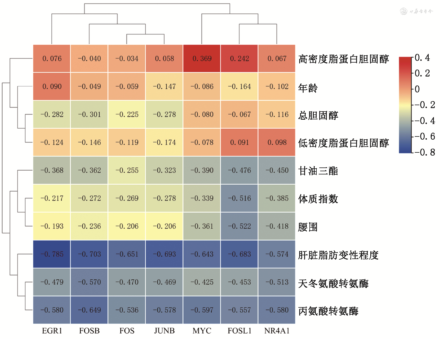 5.核心基因表达与预后临床指标相关性分析:预后临床指标包括年龄、体质指数(BMI)、腰围、肝脏脂肪变性程度、高密度脂蛋白胆固醇、低密度脂蛋白胆固醇、总胆固醇、甘油三酯、谷草转氨酶和谷丙转氨酶水平等10项。以原始芯片数据集(GSE89632)中上述指标完整的41名对象,分析核心基因与预后临床指标的相关性。