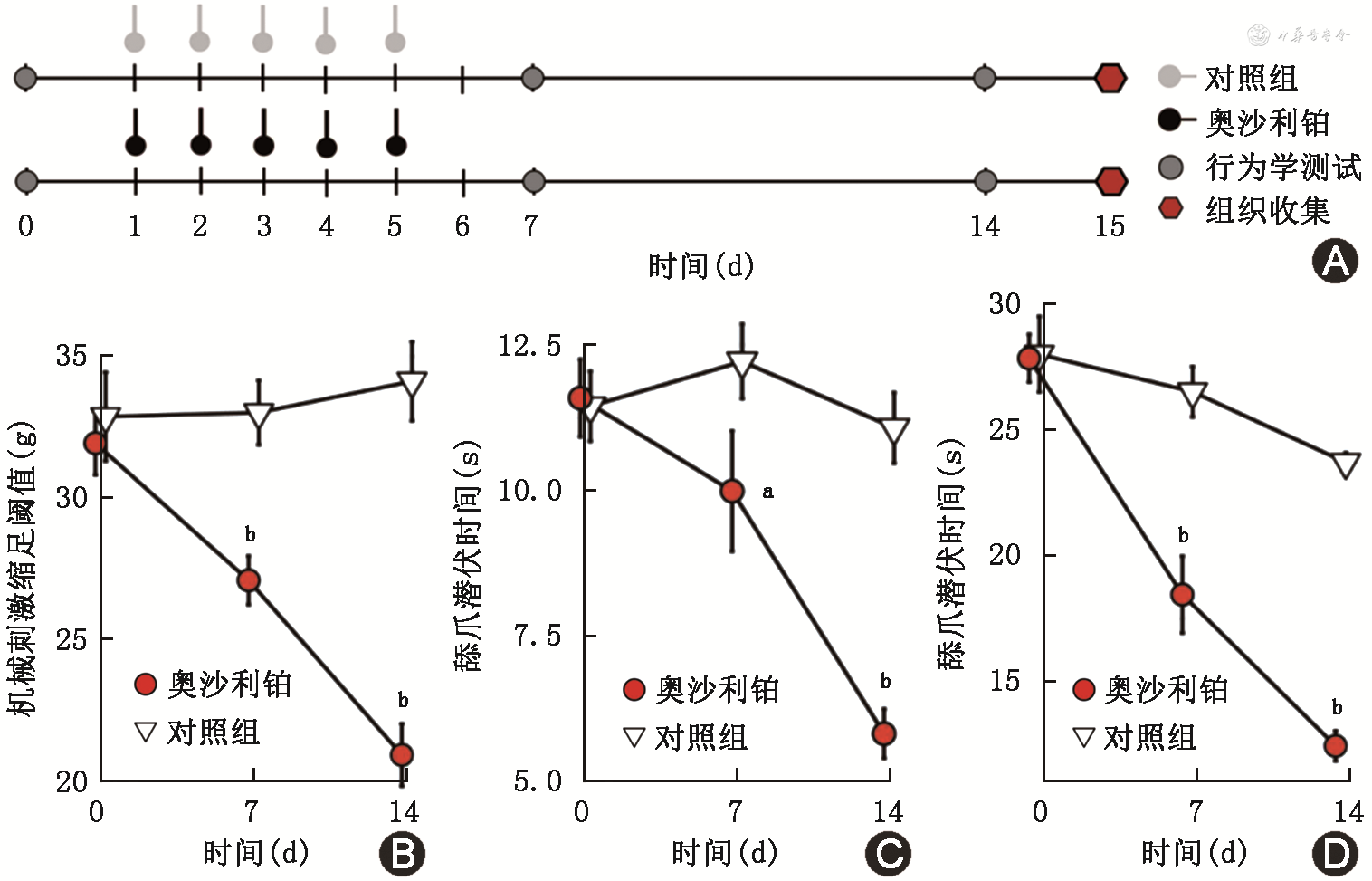 1. 奥沙利铂诱导外周病理性痛大鼠模型的建立:实验设计如图1A所示,奥沙利铂连续5 d腹腔注射给药,给药前、给药后第7天和第14天测定行为学阈值[12]。与对照组相比,实验组在给药第7天和第14天的von-Frey试验中出现阈值降低(P<0.001,图1B);热板试验(P<0.05,图1C)以及冷丙酮试验中的舔爪潜伏时间缩短(P<0.01,图1D),表明奥沙利铂诱导外周病理性痛大鼠模型建立成功。