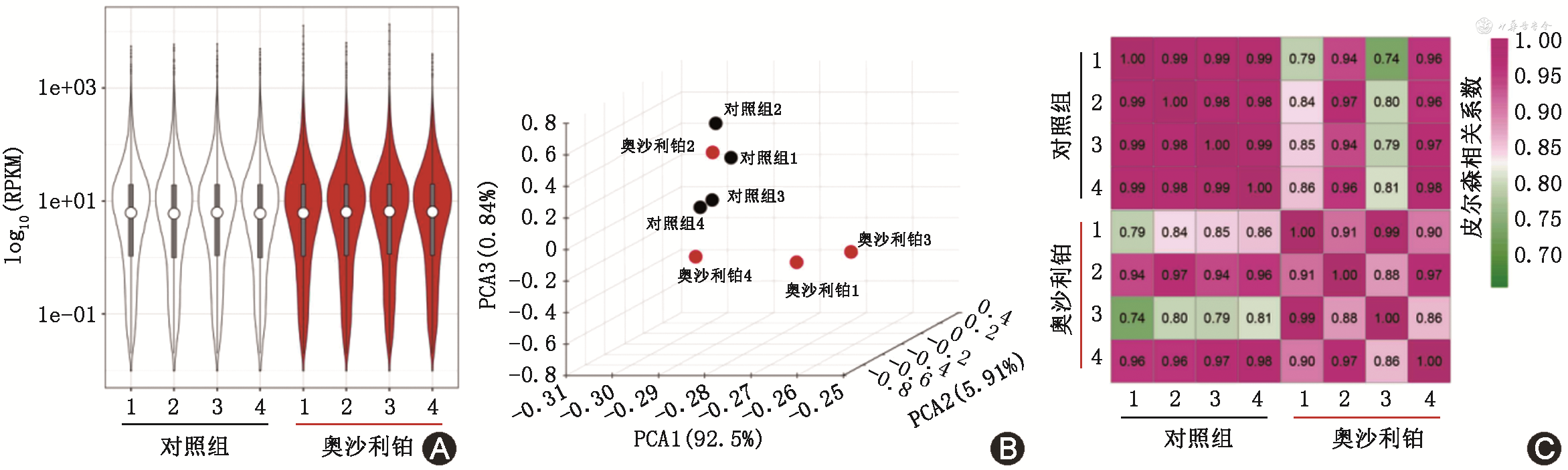 2. 转录组测序对奥沙利铂诱导外周病理性痛大鼠模型的基因表达定量:通过转录组测序共定量20 152个基因,各组基因表达水平的分布情况如图2A所示,各样品基因表达水平均一致(图2B),通过主成分分析(PCA)并结合Pearson检验的Pearson相关系数(图2C),表明对照组和实验组的各重复样品之间相关性较高,转录组测序结果可靠。