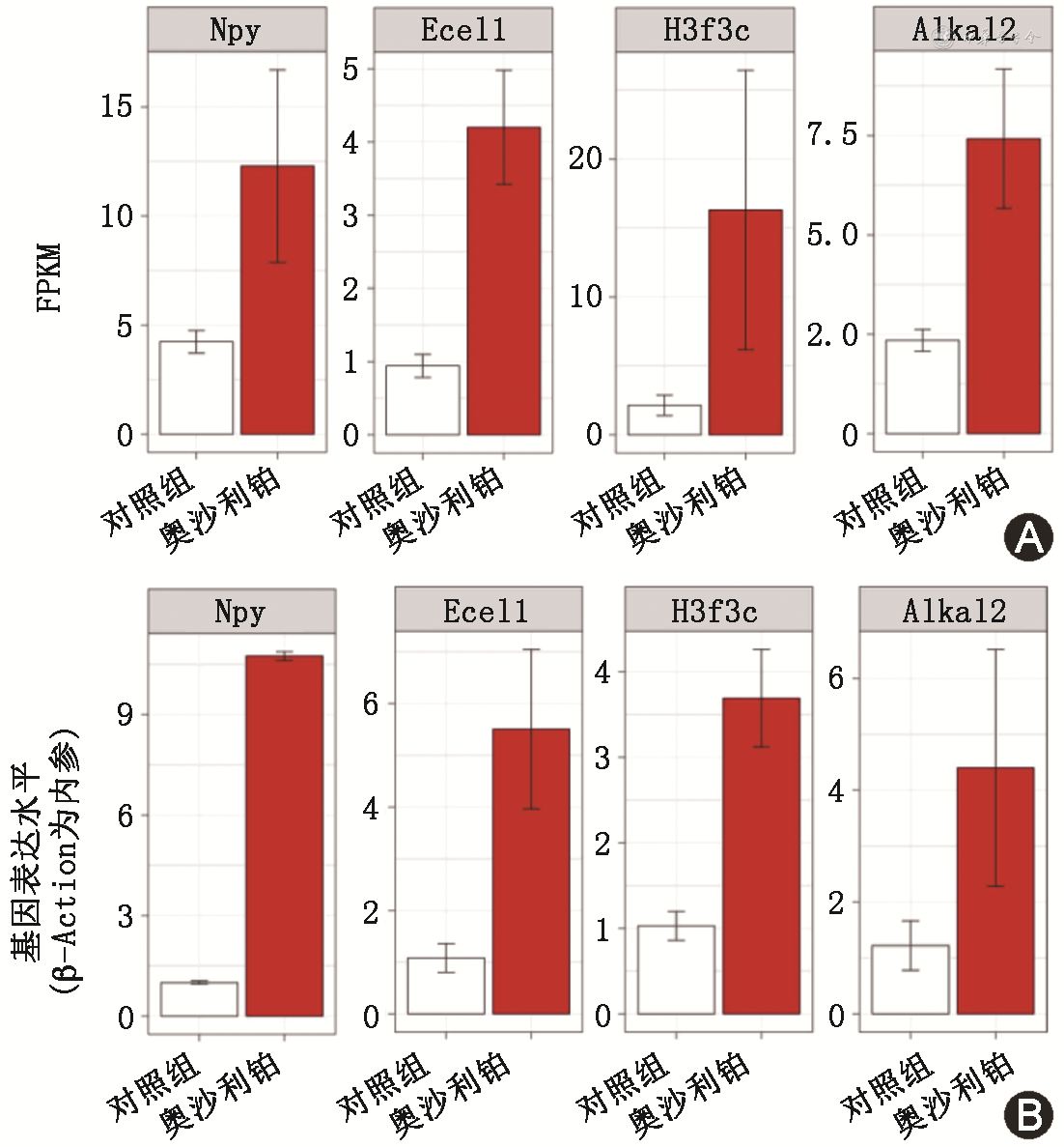 4. qPCR验证奥沙利铂诱导的差异表达基因:为了验证转录组测序定量的准确性,本研究选取显著受奥沙利铂影响的差异表达基因进行qPCR验证(图4)。qPCR技术与转录组测序技术对各组中Npy、Ecel1、H3f3c、Alkal2的定量结果基本一致,表明转录组测序结果可靠。