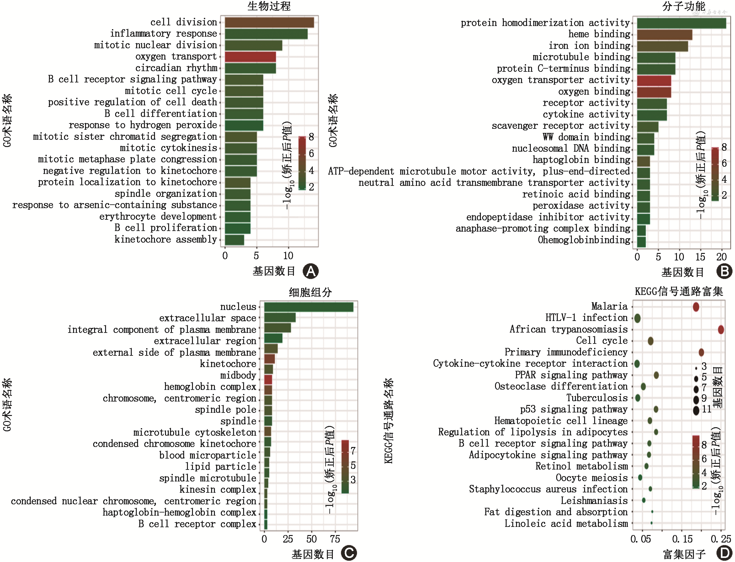 5. 奥沙利铂诱导外周病理性痛大鼠模型的差异表达基因功能分析:为了进一步了解奥沙利铂诱导的差异表达基因相关功能,对差异表达基因进行GO功能富集分析。图5展示了GO分析富集到20个最显著的GO 功能以及差异基因个数分布情况。受奥沙利铂影响的差异表达基因参与的生物学过程主要有:氧运输、细胞分裂(图5A);细胞组成主要有中间体、着丝粒(图5B);分子功能主要有:氧转运蛋白活性、氧结合(图5C)。与此同时,对差异表达基因进行KEGG信号通路富集分析(图5D),受奥沙利铂影响的差异表达基因参与的KEGG信号通路主要有:疟疾、非洲锥虫病、原发性免疫缺陷、过氧化物酶体增殖物激活受体信号通路。通过对受奥沙利铂影响差异表达基因进行GO功能与KEGG信号通路富集分析,提示奥沙利铂给药15 d后,大鼠DRG组织氧运输、氧转运蛋白活性相关基因的表达受到奥沙利铂干扰,并且奥沙利铂可引起类似疟疾、非洲锥虫病等疾病的信号通路反应。