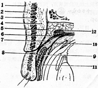 自眶上缘至睑缘上睑的解剖学结构可分为11层:(1)皮肤。40侧上睑中有睑皱褶(即重睑)者18侧,占45%,皱褶位在睑缘上方3.0-6.5(4.6±1.0)mm。(2)皮下组织。(3)眼轮匝肌睑部。(4)肌下组织层。(5)眶隔。(6眶隔)后间隙或腱膜前间隙。(7)提肌腱膜。(8)腱膜后间隙或睑板前间隙。(9)睑板。(10)上睑板肌(Müller氏肌)。(11)睑结膜。作者等着重调查了第5、6、7三层的局解特点。