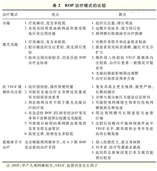 目前应用于急性期ROP(1~3期)的治疗方式包括冷凝(已少用)、激光光凝和抗VEGF药物玻璃体内注射;对于4期、5期及出现瘢痕收缩等并发症的ROP,玻璃体视网膜手术是必要的治疗手段。各治疗方法的优缺点比较见表2。