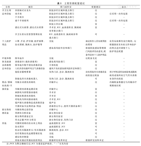 医疗机构应加大医院感染和传染病防控资源配置、经费投入和满足临床需求的人员配置。每年根据文件和医院感染管理部门意见拨付专项经费以保障感染控制标准预防措施的落实。主要资源配置建议见表1。