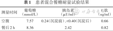实验室及辅助检查:(1)常规化验检查:尿葡萄糖2+,尿酮体±;血清白蛋白37.6 g/L(参考值40~55 g/L),血钾3.44 mmol/L(参考值3.5~5.3 mmol/L);血常规、大便常规、感染四项(乙肝两对半、梅毒抗体、艾滋病抗体和丙肝抗体)、肿瘤标志物筛查、凝血功能、血脂、肝功能、肾功能均未见异常。(2)甲状腺相关检查:甲状腺功能未见异常。(3)骨代谢相关检查:血钙、血磷、甲状旁腺激素及其他骨代谢指标均未见异常。(4)糖尿病相关检查:糖化血红蛋白14.3%,糖化白蛋白37.7%,尿白蛋白/肌酐比值15.31 mg/g,胰岛细胞抗体、胰岛素抗体及谷氨酸脱羧酶抗体均阴性。患者行混合餐糖耐量试验结果见表1。影像学检查腹部超声提示轻度脂肪肝;下肢血管超声提示双侧足背动脉散在斑块;甲状腺超声提示甲状腺多发囊实性结节。