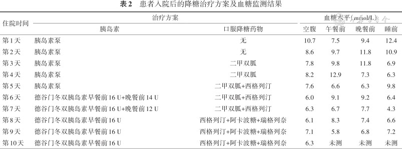 患者为中年女性,急性病程,多次测空腹血糖>7.0 mmol/L,随机血糖>11.1 mmol/L,糖化血红蛋白>6.5%,体型肥胖,有糖尿病家族史,病程中无“三多一少”症状,无自发酮症酸中毒倾向,考虑为2型糖尿病。患者病程较短,起病时血糖高,查C肽及胰岛素水平尚可,需警惕成年隐匿性自身免疫性糖尿病(latent autoimmune diabetes in adults,LADA)的可能,但患者谷氨酸脱羧酶抗体阴性,可排除LADA诊断。患者无急慢性胰腺炎、胰腺肿瘤、腹部创伤、胰腺切除、肾上腺疾病等其他内分泌疾病、特殊用药、病毒感染病史,可排除上述病因导致的特殊类型糖尿病。入院后予胰岛素泵(0∶00~3∶00用量为0.4 U/h,3:00~7∶00用量为0.7 U/h,7:00~19∶00用量为0.6 U/h,19:00~0∶00用量为0.5 U/h)强化治疗,逐步调整胰岛素泵泵速,患者血糖控制较前改善,逐渐减少胰岛素剂量,加用二甲双胍(0.5 g,3次/d)及西格列汀(100 mg,1次/d)口服降糖治疗。患者血糖进一步改善,空腹血糖维持在6~7 mmol/L,过渡为德谷门冬双胰岛素早餐前16 U及晚餐前14 U皮下注射联合二甲双胍及西格列汀口服治疗,逐步滴定胰岛素剂量。患者血糖控制平稳,进一步简化方案为德谷门冬双胰岛素早餐前16 U一针皮下注射,因患者不能耐受二甲双胍,调整为联合阿卡波糖(50 mg,3次/d)、西格列汀(100 mg,1次/d),并分别于午餐及晚餐前口服瑞格列奈0.5 mg,患者血糖控制良好(表2),遵医嘱出院。