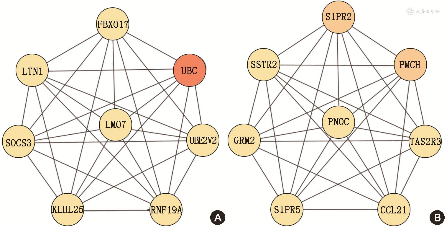 注:LTN1为李斯特E3泛素蛋白连接酶1;FBXO17为F-box蛋白17;UBC为泛素C;SOCS3为细胞因子信号转导抑制因子3;LMO7为LIM域特有蛋白7;KLHL25为Kelch样蛋白25;UBE2V2为泛素结合酶E2V2;RNF19A为环指蛋白19A;SSTR2为生长抑素受体2;S1PR2为鞘氨醇-1-磷酸受体2;PMCH为促黑色素聚集激素;PNOC为孤啡肽前体;GRM2为代谢型谷氨酸受体2;TAS2R3为味觉受体2型成员3;S1PR5为鞘氨醇-1-磷酸受体5;CCL21为CC型趋化因子配体21