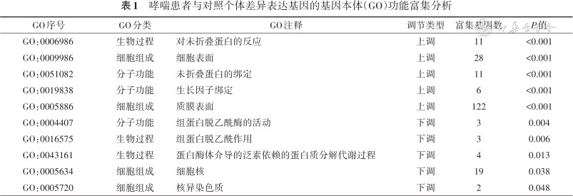 3.统计学分析:DEGs利用t检验的P值和差异倍数进行筛选,筛选标准为上调或者下调差异倍数>1.2且P<0.05。对DEGs进行GO及KEGG分析,双侧检验,检验水准α=0.05。采用R 4.0.4软件对哮喘患者和对照个体的DEGs绘制热图。