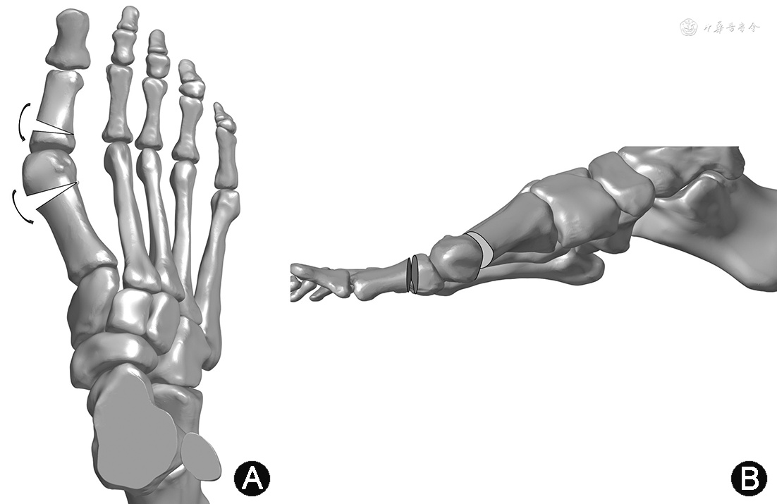 多项研究证实,此类技术的影像学及术后功能评分、患者满意度等方面取得了良好的随访结果,尤其是针对DMAA和拇外翻角(HVA)的改善十分明显[22, 23, 24];但也存在明显的劣势,由于截骨方式并未改变第一跖骨的内收位置,此类技术的适应证仅限于轻中度拇外翻[第一二跖骨间角(IMA)≤15°,HVA≤30°],并且伴有明显增大的DMAA和第一跖趾关节匹配者[21]。
