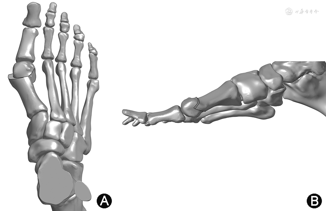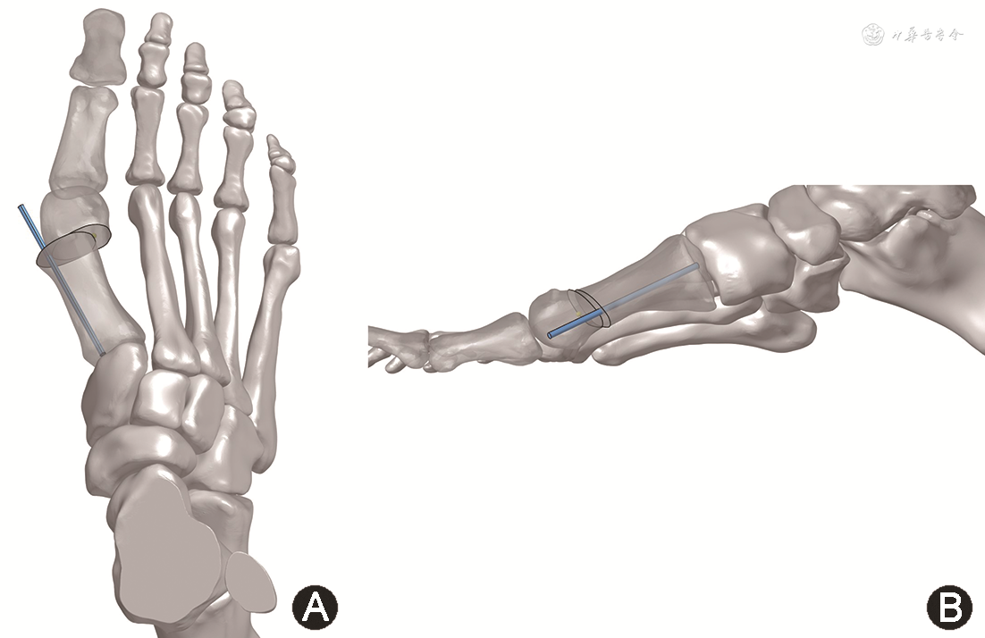 最早将微创技术应用于足踝部可追溯到1945年的美国学者Morton Polokoff[6],但当时微创技术并没有得到广泛的发展,直到1991年的Isham[7]对Reverdin截骨术进行了改进,逐渐打开了微创技术治疗拇外翻的大门,我国学者温建民等[8]也从1993年开始,行小切口下中西医结合微创治疗拇外翻。而Reverdin-Isham技术也被称为第一代拇外翻微创技术[9, 10],因其本身缺乏内固定,容易发生骨不连、复杂性畸形等并发症,应用并不广泛[10]。由Bösch等[11]提出的关于跖骨颈部行经皮远端横行截骨术,并使用克氏针进行内固定,被称为第二代微创技术。尽管多篇文献报道第二代技术效果良好[11, 12],但其术后引起的钉道感染及稳定性不高仍是其不可否认的弊端,主要在欧洲应用[10]。针对于前两代微创技术的不足,Vernois[13]和Redfern等[14]在2011年提出的微创下行远端跖骨Chevron截骨联合Akin截骨术(minimally invasive Chevron and Akin osteotomies,MICA)被称为拇外翻第三代微创技术,此类微创技术采用了螺钉进行内固定,较前两代技术提供了更大的稳定性,得益于此,近10年来有大量关于MICA的文献相继发表,对此类技术的临床疗效、与开放手术的对比、术后并发症等方面均有详细的阐述[4,15, 16, 17, 18, 19]。