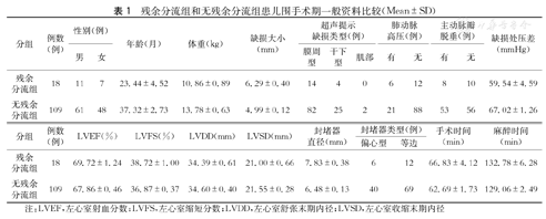 术后3~7 d心脏彩色超声检查提示有残余分流共18例(14.2%),为残余分流组,残余分流宽度1~2.3 mm;其余109例患儿为无残余分流组。两组患儿围手术期一般资料,详见表1。