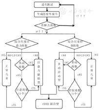 IVA-CPT是由美国Brainstrain公司生产并由南京伟思公司引进的注意检测系统,可以同时检测视觉和听觉的控制力和注意力。该测试要求被测试者对目标"1"(听到或看到)作出响应(快速点击鼠标左键1次),对干扰"2"(听到或看到)不作出响应(不点击鼠标)。首先测试者向被测试者讲解IVA-CPT的测试规则,确定其理解后进入测试系统;在热身阶段如果发现被测试对象没有真正理解,则暂停测试,进一步解释;进入主测试后,观测者仍在其一旁观察,但不给予任何干扰和提示,主测试结束后进入恢复阶段,最后测试完成,整个过程约需20 min。测试时,软件通过记录反应时间、重复反应次数、遗漏和错误点击等情况,计算出各个参数反映被检查者的反应控制和注意力水平,结果输出28个商数。测试结束后,按照流程对测试者进行评估判断(图1)。